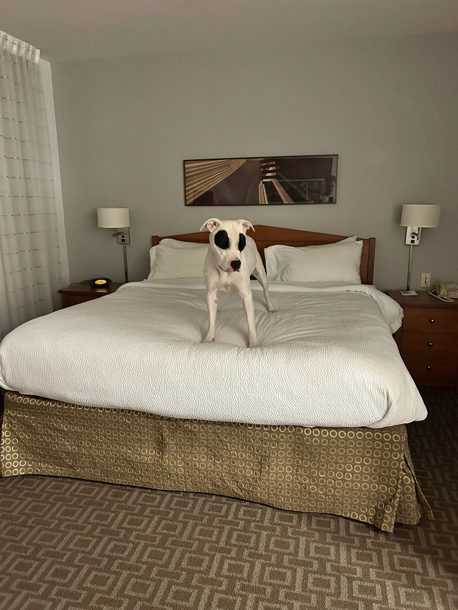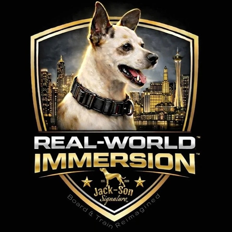 Real-World Immersion™ is a hotel-based board & train where your dog lives alongside me as part of the training process, receiving full-time structure, guidance, and real-life exposure. Dogs practice calm behavior, daily routines, and emotional regulation in everyday environments—walking through buildings, resting quietly, navigating public spaces, and settling without reliance on crates or kennel routines.